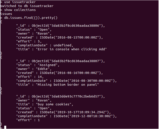 讓我向您解釋一個從MongoDB集合獲取數據的簡短示例。假設我們的收藏名為“問題”。在下面的示例中,我們從一個名為issues的集合中獲取數據,并使用pretty()函數以更好的格式顯示數據。